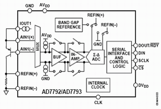 儀表放大器允許開發(fā)低噪聲、低溫漂的增益級(jí)電路。低噪聲與低溫漂非常關(guān)鍵,可以保證因溫度變化引起的電壓變化大于儀表放大器的噪聲電壓。AD7793的增益可以設(shè)置為1, 2, 4, 8, 16, 32, 64,或128。利用128倍的最大增益設(shè)置以及產(chǎn)生的基準(zhǔn)電壓源,AD7793的滿度范圍是±1.17 mV/128 mV或者大約±10 mV。這樣,ADC的高分辨率特點(diǎn)保證無需任何外部放大器元件就可以達(dá)到最佳效果。