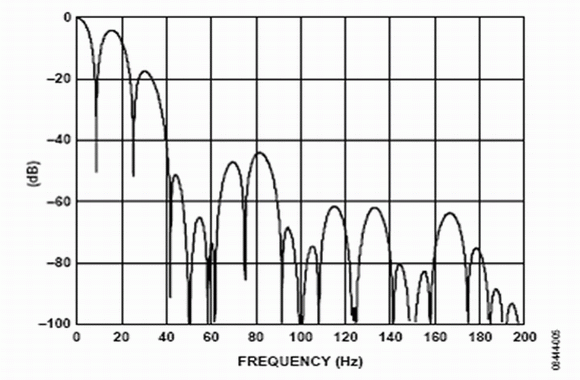 Σ-Δ模數(shù)轉(zhuǎn)換器的內(nèi)置數(shù)字濾波器對(duì)于抑制帶外量化噪聲以及其他噪聲源非常有效。噪聲源之一是電力網(wǎng)供電系統(tǒng)產(chǎn)生的頻率。當(dāng)電力網(wǎng)為器件供電時(shí),將產(chǎn)生50 Hz及其倍頻的供電系統(tǒng)頻率(在歐洲),或產(chǎn)生60 Hz及其倍頻的供電系統(tǒng)頻率(在美國)。窄帶模數(shù)轉(zhuǎn)換器主要采用sinc濾波器。AD7793有4個(gè)濾波器選項(xiàng),模數(shù)轉(zhuǎn)換器可以根據(jù)更新速率自動(dòng)選擇需要使用的濾波器種類。在16.6 Hz的更新速率使用sinc3濾波器。如圖5所示,sinc3濾波器在頻譜內(nèi)存在凹槽。當(dāng)輸出字速率為16.6 Hz時(shí),可以利用這些凹槽同時(shí)抑制50 Hz或60 Hz的頻率。