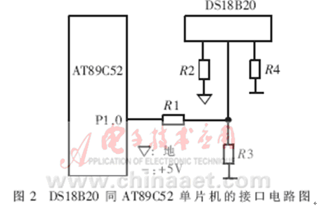 DS18B20的測溫原理為:內(nèi)部計數(shù)器對一個受溫度影響的振蕩器的脈沖計數(shù),低溫時振蕩器的脈沖可以通過門電路,而當(dāng)?shù)竭_(dá)某一設(shè)置高溫時,振蕩器的脈沖無法通過門電路。計數(shù)器設(shè)置為-55℃時的值,如果計數(shù)器到達(dá)0之前門電路未關(guān)閉,則溫度寄存器的值將增加,這表示當(dāng)前溫度高于-55℃。同時,計數(shù)器復(fù)位在當(dāng)前溫度值上,電路對振蕩器的溫度系數(shù)進(jìn)行補(bǔ)償,計數(shù)器重新開始計數(shù)直到回零。如果門電路仍然未關(guān)閉,則重復(fù)以上過程。溫度轉(zhuǎn)換所需時間不超過750ms,得到的溫度值的位數(shù)因分辨率不同而不同[2]。DS18B20同AT89C52單片機(jī)的接口電路如圖2所示。這種接口方式只需占用單片機(jī)一根口線,與智能儀器或智能測控系統(tǒng)中的其它單片機(jī)或DSP的接口也可采用類似的方式。