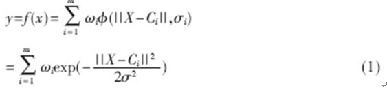 上式中,m是隱含層結(jié)點(diǎn)數(shù);||•||是歐幾里德范數(shù);X,Ci∈Rn, ωi是第i個基函數(shù)與輸出結(jié)點(diǎn)的連接權(quán)值(i=1,2,...,m)。