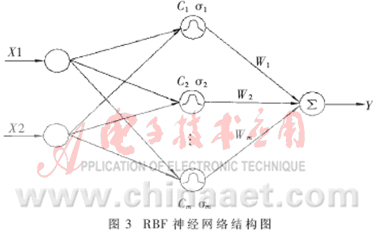 RBF神經(jīng)網(wǎng)絡(luò)即徑向基函數(shù)(Radial Basis Function)神經(jīng)網(wǎng)絡(luò)[3~4],其結(jié)構(gòu)如圖3所示。它很容易擴(kuò)展到多輸出節(jié)點(diǎn)的情形,在此只考慮一個輸出變量Y的情況。RBFNN包括一個輸入層、一個隱含層和一個輸出層的最簡模式。隱含層由一組徑向基函數(shù)構(gòu)成,與每個隱含層節(jié)點(diǎn)相關(guān)的參數(shù)向量為Ci(即中心)和σi(即寬度)。徑向基函數(shù)有多種形式,一般取高斯函數(shù)[5]。具體如下: