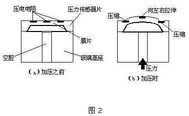 圖1為PS壓力傳感器的截面結(jié)構(gòu)圖,圖2為其傳感器部分的結(jié)構(gòu)。如圖所示,在壓力傳感器半導(dǎo)體硅片上有一層擴(kuò)散電阻體,如果對(duì)這一電阻體施加壓力,由于壓電電阻效應(yīng),其電阻值將發(fā)生變化。受到應(yīng)變的部分,即膜片由于容易感壓而變薄,為了減緩來(lái)自傳感器底座應(yīng)力的影響,將壓力傳感器片安裝在玻璃基座上。