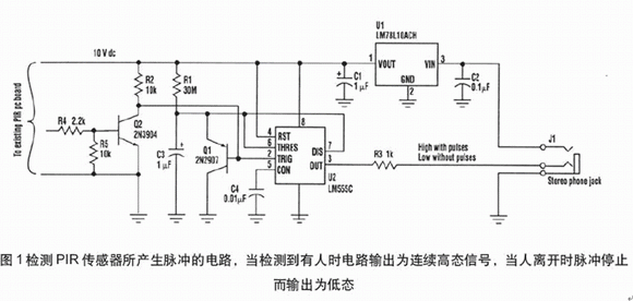 通常,當所檢測區(qū)域無人時,無脈沖被檢測,而輸出為低態(tài)。當檢測到脈沖時,輸出變高態(tài)。電源(12~14Vdc)通過立體聲電話插口(與輸出信號一道)供電,然后穩(wěn)壓到+10V。此電路放置在PIR傳感器內(nèi),電話插口放在機盒的下部。電阻器R4連接PIR LED驅動器。地和+10V連接到PIR中的適當位置。