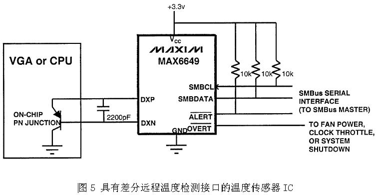 圖5為筆記本電腦普遍使用的一種溫度控制方案。溫度傳感器IC通過SMBus接口連接到筆記本電腦的嵌入式微控制器,由于溫度傳感器IC與嵌入式微控制器之間為數(shù)字接口,因此溫度傳感器IC在位置上可以遠(yuǎn)離嵌入式微控制器而不會有噪聲干擾問題。MAX6649同時內(nèi)置一個本地溫度傳感器和用于連接遠(yuǎn)端二極管的差分接口。MAX6649的IDH=100uA,IDL=10uA,高精度、小電流的電流源可減小因雜散電阻所產(chǎn)生的測量誤差。差分輸入有助于降低噪聲干擾。圖5所示電路,溫度傳感器IC只負(fù)責(zé)溫度檢測,風(fēng)扇轉(zhuǎn)速控制由嵌入式微控制器完成,由軟件實現(xiàn)。為了避免軟件控制的死機(jī)問題,MAX6649還集成了保護(hù)功能,當(dāng)溫度到達(dá)第一個高溫臨界點時,MAX6649 ALERT可發(fā)出中斷請求,要求嵌入式微控制器進(jìn)行相應(yīng)的處理,例如對處理器進(jìn)行降頻;如果上述對策仍無法有效抑制溫度的上升,當(dāng)溫度達(dá)到第二高溫臨界點時,MAX6649 OVERT可以用來控制系統(tǒng)的第二個風(fēng)扇或?qū)ο到y(tǒng)進(jìn)行強(qiáng)制關(guān)機(jī)。圖5具有低成本、高精度、使用彈性大等優(yōu)點,但在軟件的設(shè)計上需花費較多的功夫。