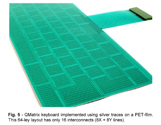 圖5: 利用 PET 薄膜上的銀線來(lái)實(shí)現(xiàn)的 QMatrix 鍵盤(pán),這個(gè) 64 鍵布局只需要 16 個(gè)互聯(lián) (8X + 8Y線)。