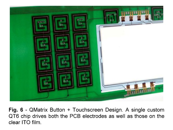 圖6:QMatrix 按鍵和觸摸屏的一體式設(shè)計(jì),利用一片 QT6 單芯片同時(shí)驅(qū)動(dòng) PCB 電極以及 ITO 薄膜上的鍵盤(pán)。
