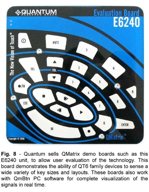 圖8 :量研科技銷(xiāo)售 QMatrix 演示版如 E6240,為用戶提供該技術(shù)的評(píng)測(cè)手段。該評(píng)測(cè)板可以支持各種按鍵尺寸和布局,演示 QT6 系列器件的強(qiáng)大功能。QMatrix 演示版還可配合 QmBtn 軟件使用,以進(jìn)行按鍵實(shí)時(shí)信號(hào)的全景視象化觀測(cè)。