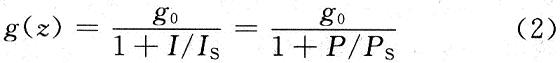 式中:g0是由泵浦強(qiáng)度定的小信號(hào)增益系數(shù),由于增益飽和現(xiàn)象,隨著信號(hào)功率的增加,增益系數(shù)下降;Is,Ps分別為飽和光強(qiáng)和飽和光功率,是表明增益物質(zhì)特性的量,與摻雜系數(shù)、熒光時(shí)間和躍遷截面有關(guān)。