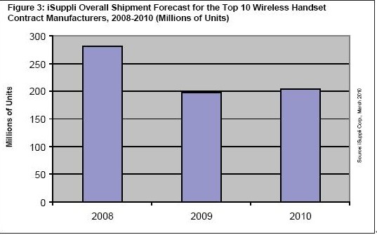 iSuppli公司預(yù)測,10大ODM與OEM廠商的總體出貨量2010年將增長3.4%,從2009年的1.975億部增至2.042億部,這是非常溫和的增長。