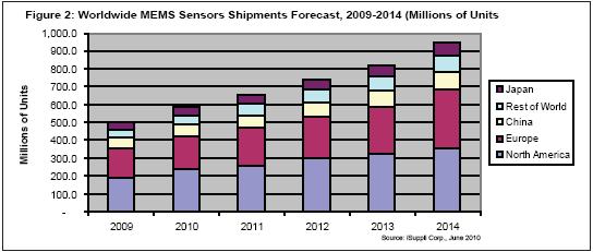鑒于中國汽車出貨量迅速增長,在該地區(qū)已經(jīng)建立據(jù)點(diǎn)的供應(yīng)商,如Bosch和Continental,都逃過了經(jīng)濟(jì)衰退的最嚴(yán)重影響。2009年中國市場占總體MEMS消費(fèi)量的11%,未來幾年將繼續(xù)增長,到2014年將成為全球第三大市場,領(lǐng)先于日本和“世界其它地區(qū)”。iSuppli公司認(rèn)為,這些動態(tài)未來五年對于MEMS傳感器供應(yīng)商來說是好消息。