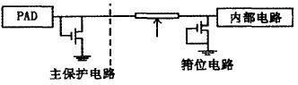 防護(hù)ESD的一種有效方法,即設(shè)計(jì)特定的保護(hù)電路。圖10即為一種基于CMOS工藝的IC卡芯片ESD保護(hù)電路7。該結(jié)構(gòu)包括兩個(gè)部分:主保護(hù)電路和箝拉電路。在ESD發(fā)生時(shí),箝拉電路首先導(dǎo)通,使輸入端柵上的電壓箝拉在低于柵擊穿的電壓。中間的串聯(lián)電阻起限流作用,更重要的是使PAD上的電壓能觸發(fā)主保護(hù)電路的開啟,使ESD能量通過主保護(hù)電路得到釋放。