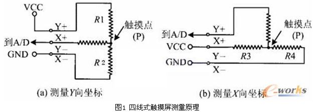 觸摸層的兩個(gè)金屬導(dǎo)電層分別用來測(cè)量X軸和Y軸方向的坐標(biāo)。用于X坐標(biāo)測(cè)量的導(dǎo)電層從左右兩端引出兩個(gè)電極,記為X+和X-。用于Y坐標(biāo)測(cè)量的導(dǎo)電層從上下兩端引出兩個(gè)電極,記為Y+和Y-。這就是四線電阻觸摸屏的引線構(gòu)成。當(dāng)在一對(duì)電極上施加電壓時(shí),在該導(dǎo)電層上就會(huì)形成均勻連接的電壓分布國。若在X方向的電極對(duì)上施加一確定的電壓,而Y方向電極對(duì)上不加電壓時(shí),在X平行電壓場(chǎng)中,觸點(diǎn)處的電壓值可在在Y+(或Y-)電極上反映出來,通過測(cè)量Y+電極對(duì)地的電壓大小,便可得知觸點(diǎn)的X坐標(biāo)值。同理,當(dāng)在Y電極對(duì)上加電壓,而X電極對(duì)上不加電壓時(shí),通過測(cè)量X+電極的電壓,便可得知觸點(diǎn)的Y坐標(biāo)。測(cè)量原理如圖1所示。