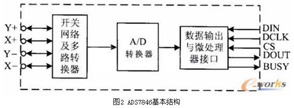 觸摸屏控制器有多種,主要的功能均是在微處理器的控制下向觸摸屏的兩個(gè)方向分時(shí)施加電壓,并將相應(yīng)的電壓信號(hào)傳送給自身A/D轉(zhuǎn)換器,在微處理器SPI口提供的同步時(shí)鐘作用下將數(shù)字信號(hào)讀入微處理器??刂破鰽DS7846基本結(jié)構(gòu)如圖2所示。