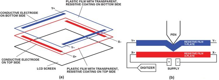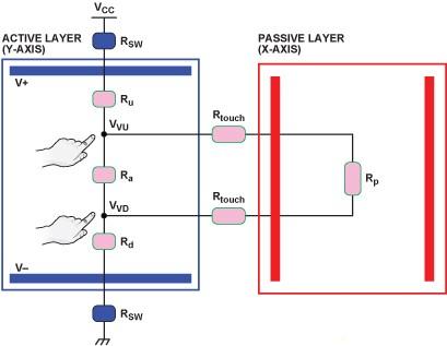 連接直流電壓的層稱為“有源”層,電流與其阻抗成反比。測(cè)量電壓的層稱為“無源”層,無相關(guān)電流流經(jīng)該層。發(fā)生單點(diǎn)觸摸時(shí),在有源層中形成一個(gè)分壓器,無源層電壓測(cè)量通過一個(gè)模數(shù)轉(zhuǎn)換器讀取與觸摸點(diǎn)和負(fù)電極之間的距離成比例的電壓1.