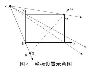 假設(shè)虛擬觸摸屏是如圖4所示的矩形區(qū)域,以左下角為原點,建立二維坐標(biāo)平面x、y。左邊攝像頭c1位于虛擬觸摸屏左上角某處,其視角范圍應(yīng)包含整個矩陣區(qū)域,將c1與矩形的4個頂點連接構(gòu)成攝像頭拍攝各點的光線方向,以經(jīng)過左下角和右上角頂點的光線方向為腰,c1為頂點作一個等腰三角形,底為虛線所示的(u1,u2)。當(dāng)手指在矩形區(qū)域內(nèi)任意一點觸摸時,其在攝像頭所拍攝的圖像中均表現(xiàn)為虛線上的一點,手指在二維虛擬觸摸屏上的移動投影到圖像上不會超過這條虛線(u1,u2)范圍,這是算法關(guān)注的興趣區(qū)域,區(qū)域以外的部分不需要處理。因此以u1為原點沿著虛線方向建立一維坐標(biāo)x1,右邊攝像頭拍攝圖像中的一維坐標(biāo)x2類似設(shè)立。