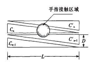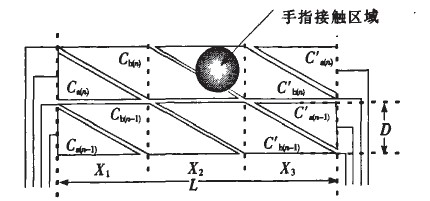 Ca(n)、Cb(n)、為第一組感應(yīng)電極,Cb(n)、Cb(n)''''為第二組感應(yīng)電極,Ca(n)''''、Cb(n)''''為第三組感應(yīng)電極,分別感應(yīng)X1、X2、X3范圍內(nèi)坐標(biāo)點的位置。具體坐標(biāo)計算方法與上述類似。設(shè)計中需要注意X1、X2、X3每組電極的寬度應(yīng)與手指接觸面積的寬度相當(dāng),如寬度不足則需要增加菱形電極,否則手指接觸在相同區(qū)域內(nèi)無法識別兩個感應(yīng)點。