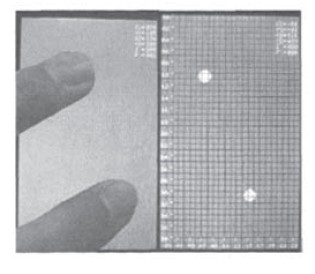 實際電極設(shè)計中,每對感應(yīng)單元設(shè)計為多組電極,并根據(jù)Lens的厚度設(shè)計電極面積以及間隙大小。間隙過大會導(dǎo)致線縫可見,因此使用假電極進(jìn)行填充使線縫在30μm以內(nèi)則可以避免上述問題。經(jīng)過實際測試,在實現(xiàn)單點觸控基本功能的同時,能夠?qū)崿F(xiàn)兩點觸控,滿足設(shè)計要求。操作效果如圖5所示。