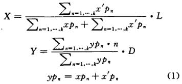 其中Cn代表第九組電極的Cp。n代表電極的組數(shù),L是電極寬,D是一組電極的高。其X坐標(biāo)的計算是通過左側(cè)通道的感應(yīng)值加和與右側(cè)通道感應(yīng)值加和的比例來計算的。y是通過同一行的左右兩通道感應(yīng)值的加和與上下行的感應(yīng)值加和的比例來計算的。具體計算方法由式(1)確定: