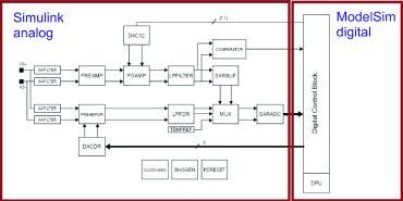 確定磁場(chǎng)之后是傳感器系統(tǒng)仿真。AMR 元件的電阻變化是各向異性磁阻效應(yīng)的直接結(jié)果。這樣,磁場(chǎng)仿真的結(jié)果會(huì)導(dǎo)致代表信號(hào)處理中輸入信號(hào)的電阻發(fā)生變化。對(duì)模擬前端進(jìn)行建??刹捎?Simulink。這種行為模型是概念設(shè)計(jì)的產(chǎn)物,標(biāo)志著產(chǎn)品開(kāi)發(fā)的起點(diǎn)。每個(gè) Simulink 塊對(duì)應(yīng)一個(gè)模擬信號(hào)處理組件,例如放大器或過(guò)濾器。但是,尚未考慮模擬組件的控制部分,這由數(shù)字系統(tǒng)實(shí)現(xiàn)。HDL 設(shè)計(jì)則仿真通過(guò)數(shù)字方法實(shí)現(xiàn)的功能,而且在完成產(chǎn)品開(kāi)發(fā)之后就會(huì)最終成形。因此,整體系統(tǒng)仿真是 Simulink 對(duì)模擬組件的行為模型以及 ModelSim 對(duì) HDL 設(shè)計(jì)的共同仿真(圖8)。可通過(guò)仿真從概念階段順利過(guò)渡到 HDL 設(shè)計(jì)及后續(xù)階段。在共同仿真中,可用 ModelSim 中部署的 Verilog 代碼逐漸代替 Simulink 參考模型,從而可逐項(xiàng)驗(yàn)證 HDL 設(shè)計(jì)??沙掷m(xù)進(jìn)行此過(guò)程,直到在 Verilog 中實(shí)現(xiàn)整個(gè)數(shù)字部件,而模擬系統(tǒng)部件仍保持為 Simulink 模型。此工具組合也已證明對(duì) IC 評(píng)估同樣有用。自始至終使用這種工具可以更容易理解 IC 行為,并可創(chuàng)建用來(lái)分析和解釋任何錯(cuò)誤的框架。這些工具的主要好處在于,能夠更快速、更準(zhǔn)確地答復(fù)客戶的查詢,以及更好地了解與環(huán)境條件相關(guān)的傳感器功能。