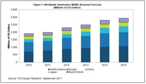 IHS iSuppli公司發(fā)布最新汽車MEMS報(bào)告,報(bào)告顯示:中國(guó)的汽車微機(jī)電系統(tǒng)(MEMS)市場(chǎng)未來幾年增長(zhǎng)速度將快于世界其它任何地區(qū)。進(jìn)一步實(shí)施汽車安全法規(guī),以及加大降低汽車碳排放的力度,將促進(jìn)中國(guó)汽車MEMS市場(chǎng)的增長(zhǎng)。