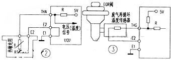 (2) 測量輸入。信號電壓。將點火開關(guān)置于 ON 位置,用萬用表的電壓擋測量圖中 ECU 的 THA 與 E2 間的電壓,該電壓值應(yīng)在 0 . 5 ~ 3 . 4V( 20 ℃ ) 范圍內(nèi)。若不在規(guī)定范圍內(nèi),則應(yīng)進一步檢查進氣溫度傳感器連接線路是否接觸不良或存在斷路、短路故障。 (3) 檢查進氣溫度傳感器連接線束電阻。用數(shù)字式萬用表的電阻擋測量傳感器插頭與 ECU 插接器端子間電阻,即傳感器信號端、地線端分別與對應(yīng)的 ECU 的兩端子電阻。如果不導通或電阻值大于 1 Ω,說明傳感器連接線路或插頭接觸不良,應(yīng)進一步撿查。
