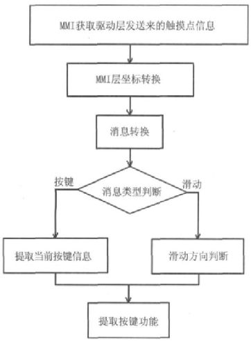 如圖6 所示,在獲得觸摸點(diǎn)消息后,系統(tǒng)MMI 層調(diào)用MMI 層坐標(biāo)轉(zhuǎn)換函數(shù)提取驅(qū)動(dòng)層發(fā)送的觸摸點(diǎn)位置信息,并轉(zhuǎn)化為MMI 層的位置信息。當(dāng)有觸摸操作進(jìn)行時(shí),底層驅(qū)動(dòng)程序向MMI 層發(fā)送觸摸點(diǎn)的位置信息。在獲得驅(qū)動(dòng)層觸摸點(diǎn)信息后,系統(tǒng)MMI 層調(diào)用MMI 層坐標(biāo)轉(zhuǎn)換函數(shù)提取驅(qū)動(dòng)層發(fā)送的觸摸點(diǎn)位置信息,并轉(zhuǎn)化為MMI 層的位置信息。如果系統(tǒng)所發(fā)事件是按下事件(MMI_PEN_EVENT_DOWN),系統(tǒng)根據(jù)觸摸點(diǎn)坐標(biāo)調(diào)用當(dāng)前按鍵信息提取函數(shù)獲得被選按鍵信息;如果是滑動(dòng)事件(MMI_PEN_EVENT_MOVE),則進(jìn)行滑動(dòng)方向判斷。