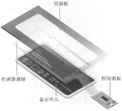 如圖5 所示,一個(gè)觸摸屏系統(tǒng)包括:前面板、傳感器薄膜、顯示單元、控制器板和系統(tǒng)軟件。
