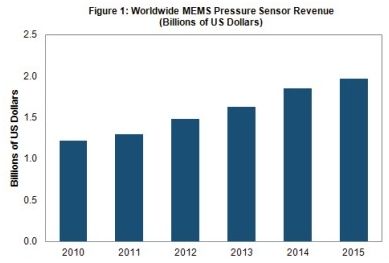 到2015年,MEMS壓力傳感器銷售額將達(dá)到19.7億美元,如圖1所示,2010-2015年的復(fù)合年度增長率為10%。