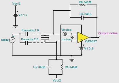 圖17 60Hz共模噪聲源對(duì)差分輸入放大器影響情況模型