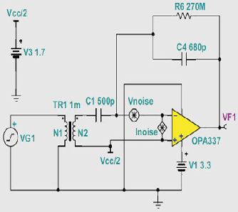 為了獲得更為實(shí)際的電路實(shí)施,我們選用了TI的OPA337.這款放大器擁有低輸入電壓和低輸入電流噪聲(請(qǐng)參見(jiàn)圖5),同時(shí)接受3V單極電源。圖6顯示了TI SPICE型仿真程序中這種電路的模型,即TINA-TI.