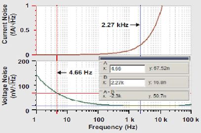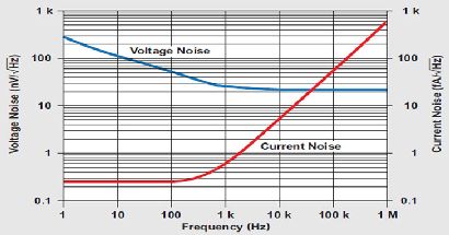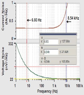 在第一項(xiàng)中,如果INA≈0.3 fA/√HZ ,且RFB =540MΩ,則該項(xiàng)對(duì)輸出噪聲的貢獻(xiàn)值約為160nV/√HZ /5.85=28nV/√HZ .