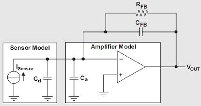 信號(hào)調(diào)節(jié)電路必須具有非低的輸入阻抗,以收集傳感器的大部分電荷輸出。因此,電荷放大器是理想的解決方案,因?yàn)橹灰糯笃髟谶@些信號(hào)頻率下保持高增益,其輸入便會(huì)讓傳感器信號(hào)出現(xiàn)虛擬接地。換句話說(shuō),如果傳感器的任何電荷想要在傳感器陽(yáng)極(Cd)或者放大器輸入寄生電容(Ca)上增大,在放大器輸入端就會(huì)形成電壓。通過(guò)拉或吸取相同量的負(fù)反饋網(wǎng)絡(luò)電荷電流,即RFB和CFB,這種電壓便立即得到了補(bǔ)償。
