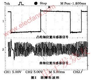 故障分析與測試采用雙蹤示波器同時(shí)測量故障車上曲軸位置傳感器與凸輪軸位置傳感器的波形如圖1所示,在同類型的正常車上測得的凸輪軸位置傳感器和曲軸位置傳感器波形如圖2所示?!?br />