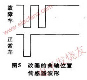有無波形可得出圖5中的2個(gè)波形,ECU只有得到圖5下圖波形才能發(fā)出點(diǎn)火信號起動(dòng)發(fā)動(dòng)機(jī),而ECU得到圖5上的波形不能發(fā)出點(diǎn)火信號起動(dòng)發(fā)動(dòng)機(jī),但在偶然的時(shí)刻故障位置產(chǎn)生的波形恰好達(dá)到合格的底線時(shí),就可以起動(dòng)發(fā)動(dòng)機(jī)。起動(dòng)后,ECU對曲軸位置傳感器波形的檢測就不是那么嚴(yán)了,因此,發(fā)動(dòng)機(jī)起動(dòng)后不會(huì)熄火。也就是此車故障的根本原因。