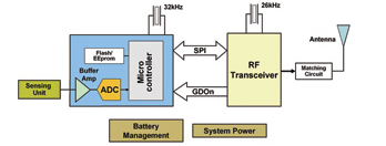 每個(gè)無線傳感器都被看作一個(gè)節(jié)點(diǎn),擁有無線通信能力,同時(shí)還具有一定的信號處理與網(wǎng)絡(luò)數(shù)據(jù)的智能。根據(jù)應(yīng)用的類型,每個(gè)節(jié)點(diǎn)都可以有一個(gè)指定的地址。圖2顯示了某個(gè)節(jié)點(diǎn)的通用結(jié)構(gòu)圖。它一般會包括一個(gè)傳感裝置、一個(gè)數(shù)據(jù)處理微控制器,以及一個(gè)無線連接RF模塊。根據(jù)不同的網(wǎng)絡(luò)定義,RF模塊可以起到一個(gè)簡單發(fā)射器或者收發(fā)器 (TX/RX)的作用。進(jìn)行節(jié)點(diǎn)設(shè)計(jì)時(shí),注意電流消耗和處理能力非常的重要。微控制器的內(nèi)存非常依賴于所使用的軟件棧。