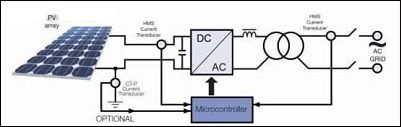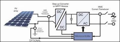 通常在剛好在PV 方陣后使用最大功率點(diǎn)跟蹤(MPPT)組件來確保方陣工作在其最大功率運(yùn)行水平。通過使用用于跟蹤功能的電流和電壓傳感器,應(yīng)用一種特殊軟件算法和專用電子元件一起來控制電池板(電池)的工作點(diǎn)。一般來說,一臺(tái)電流傳感器可用于測量單相輸出(供到電網(wǎng)的電流),而另一臺(tái)傳感器可用于測量輸入直流電流(10-25A)。在三相輸出的情況下,兩臺(tái)傳感器可用于測量三相輸出的交流電流。接入電網(wǎng)的DC/AC逆變器是一臺(tái)將直流信號(hào)轉(zhuǎn)換為正弦波的全橋逆變器。