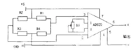 我們選用的高精度低噪聲儀用放大器AD620,可以用在傳感器輸出信號小的放大器中,如光電池傳感器、應(yīng)變片傳感器以及壓力傳感器等。由于它具有低噪聲、增益精度高、增益溫度系數(shù)小和高線性度等優(yōu)良性能。用于此系統(tǒng)中是非常理想的。AD620是一種只用一個(gè)外部電阻就能設(shè)置放大倍數(shù)為1-1000的儀表放大器,具有良好的直流性能和交流性能,AD620的體積小、功耗低成為應(yīng)用在壓力傳感器中的重要因素,傳感器信號放大電路如圖5所示。