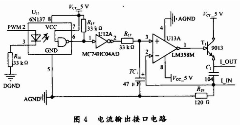 數(shù)據(jù)處理單元具備一路可控4~20 mA的電流輸出,用于現(xiàn)場指示儀表的驅(qū)動。具體的連接電路如圖4所示。其中PWM2連接ARM的PWM2引腳,PWM信號用于控制光耦的導通與截止,反相器主要用于波形的整定,根據(jù)磁敏角度和位移關(guān)系,建立數(shù)學模型,計算出PWM的占空比,從而達到電流大小調(diào)節(jié)的目的。