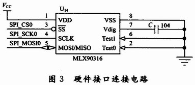 由于串行通信的輸出信號直接來自于MLX90316的內(nèi)部DSP輸出,SPI輸出模式更穩(wěn)定,誤差更小,并且具有更高的抗干擾能力。在本設計中,選用SPI接口,具體的硬件接口連接電路如圖3所示。在圖3中,MLX90316的SPI三根線與ARM LPC2136的SPl0口連接。SPI(SerialProtocol InterIace)總線接口是一種同步串行外設接口。這是一個4根信號線的串行接口協(xié)議,包括主、從兩種模式。這4根信號線分別是:時鐘線(SCK)、數(shù)據(jù)輸入線(MISO)、數(shù)據(jù)輸出線(MOSI)和從設備使能線(SS)。