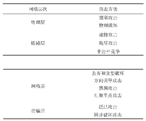 無線傳感器網(wǎng)絡(luò)(WSN)易受各種安全威脅,許多文獻(xiàn)勻有描述。文獻(xiàn)將WSN的攻擊按照不同層次分類,如表1所示。