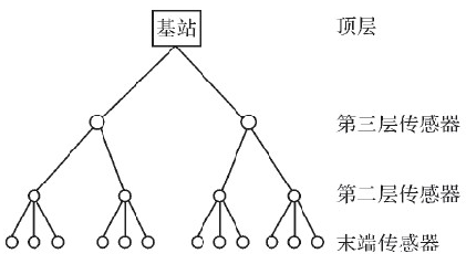 圖1為傳感器節(jié)點(diǎn)在網(wǎng)絡(luò)中的組織結(jié)構(gòu)。該方法需要一個(gè)異類網(wǎng)絡(luò):第二層和第三層傳感器節(jié)點(diǎn),在傳輸范圍和電池壽命方面要比末端傳感器更強(qiáng)。