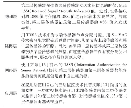 修改了Da Silva等人提出的入侵檢測算法,并將它運(yùn)用在第二和第三層傳感器上。由于傳感器資源有限,沒有在任何末端傳感器上運(yùn)用IDS.監(jiān)控節(jié)點(diǎn)的功能被分成三個(gè)階段。第一階段:所有的末端傳感器從它們周圍環(huán)境收集數(shù)據(jù),然后報(bào)告給第二層傳感器。第二階段:用基于分層的攻擊檢測方法來檢測文獻(xiàn)提出的攻擊類型。表2描述了攻擊在各層中如何被發(fā)現(xiàn)的。這種基于分層的攻擊檢測方法使得系統(tǒng)更完善。第三階段:比較每個(gè)上報(bào)的結(jié)果來定義閾值,以此來決定是否要發(fā)出一個(gè)報(bào)警。第三階段常常可以減少錯(cuò)報(bào)率。閾值可以人工定義或者根據(jù)特定的WSN需求來調(diào)整。因此,提出的入侵檢測體系結(jié)構(gòu)通過減少錯(cuò)報(bào)能夠檢測到大多數(shù)的安全威脅。