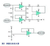 這個測量儀表放大器包含有兩個級。最后一個級(亦即輸出級)是一個差分放大器,它能夠拒絕直流電平以及同時影響兩個輸入的干擾和噪聲電壓源。由兩個放大器組成的第一級(亦即是輸入級)則被配置成一個可將輸入隔離的緩沖器。可是,基于放大器間的失配使它們彼此不能相互連接,所以要在兩個放大器之間加裝平衡電阻。將兩個級的增益相乘便可得出測量儀表放大器的增益。理論上,共模抑制比(CMPR)應該是無限大,但由于出現(xiàn)電阻失配,導致輸出級的非零共模增益非常小。在電路的輸入級中,流經(jīng)所有電阻的電流是一樣的。這都有賴于LMP2234具有高輸入阻抗和低輸入偏置電流的特點?! ?br />