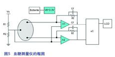 圖5所示為一個完整方案的框圖,該系統(tǒng)是由電池供電并可使用LM2623來提供3.3V的電源電壓。通過電極量度出來的電流之后會經(jīng)由一個運算放大器被轉換成一個電壓,這個電壓再被送到微控制器處理,最后顯示在LCD熒幕上。