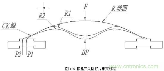 彈片自由狀態(tài)時(shí),支撐點(diǎn)為P1,當(dāng)外力“F”開始向下施力時(shí),彈片開始變形及位移,此時(shí)開始產(chǎn)生曲線。在以P1為支撐點(diǎn)時(shí),外力“F”造成彈片變形,會(huì)產(chǎn)生最小的R1,此時(shí)的外力“F”即為彈片的OF值。過了彈片OF值位置時(shí),支撐點(diǎn)P1會(huì)開始向P2位移,只要P1一位移,則R1又會(huì)變大,造成OF值變小,此時(shí)曲線即產(chǎn)生向下曲線(CK)。當(dāng)達(dá)到P2時(shí),即為P2支撐之最大R2,此時(shí)即達(dá)到彈片的BP點(diǎn)(最小OD點(diǎn))。若此時(shí)外力“F”繼續(xù)施力,則曲線又會(huì)向上產(chǎn)生曲線,上述過程如圖1.4所示。