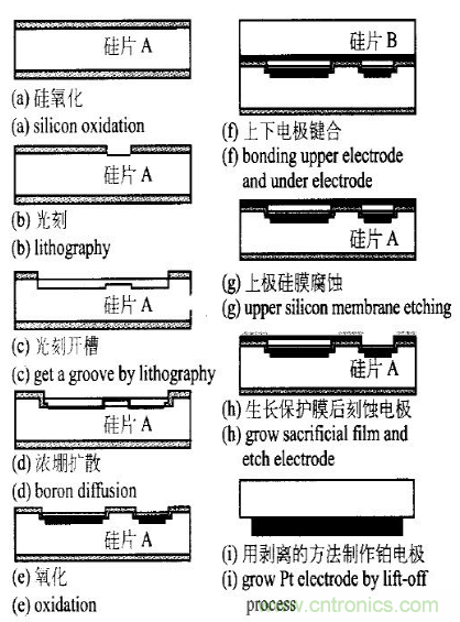 硅電容式壓力傳感器的敏感元件是半導(dǎo)體薄膜,它可以由單晶硅、多晶硅等利用半導(dǎo)體工藝制作而成。典型的電容式傳感器由上下電極、絕緣體和襯底構(gòu)成。當(dāng)薄膜受壓力作用時,薄膜會發(fā)生一定的變形,因此,上下電極之間的距離發(fā)生一定的變化,從而使電容發(fā)生變化。但電容式壓力傳感器的電容與上下電極之間的距離的關(guān)系是非線性關(guān)系,因此,要用具有補(bǔ)償功能的測量電路對輸出電容進(jìn)行非線性補(bǔ)償。由于高溫壓力傳感器工作在高溫環(huán)境下,補(bǔ)償電路會受到環(huán)境溫度的影響,從而產(chǎn)生較大的誤差?;谀P妥R別的高溫壓力傳感器,正是為了避免補(bǔ)償電路在高溫環(huán)境下工作產(chǎn)生較大誤差而設(shè)計的,其設(shè)計方案是把傳感器件與放大電路分離,通過模型識別來得到所測環(huán)境的壓力。高溫工作區(qū)溫度可達(dá)350 ℃。傳感器件由鉑電阻和電容式壓力傳感器構(gòu)成。其MEMS 工藝如下:
