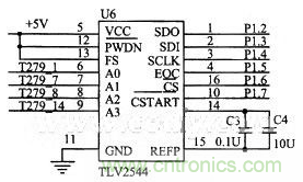 TLV2544是TI公司生產(chǎn)的高性能12位低功耗、高速(3.6μs)CMOS模數(shù)轉(zhuǎn)換器,具有采樣一保持功能,電源電壓為2.7~5.5V。TLV2544還具有3個輸入端和1個三態(tài)輸出端,可為最流行的微處理器串行端口(SPI)提供4線接口。器件在上電初始化時首先需要將初始化命令A(yù)000h寫入CFR配置寄存器,然后,對器件進(jìn)行編程,其編程方法是在初始化命令A(yù)000h的低12位000h寫入編程數(shù)據(jù)以規(guī)定器件的工作方式。TLV2544具有4種轉(zhuǎn)換模式:單次模式、重復(fù)模式、掃描模式和重復(fù)掃描模式,可用模式00.01,10,11表示。圖1為TLV2544和單片機(jī)AT89C2051的接口電路。該電路采用外部基準(zhǔn),REFP與REFM之間接0.1μF和10μF2只去耦電容器。