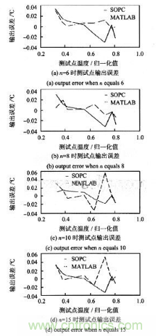 由于采用的是12 bit的A/D轉(zhuǎn)換芯片,采集數(shù)據(jù)送入FPGA系統(tǒng)板后,經(jīng)過歸一化處理,數(shù)據(jù)類型發(fā)生變化。與MATLAB仿真軟件輸出結(jié)果保持一致,基于FPGA的神經(jīng)網(wǎng)絡(luò)輸出取小數(shù)點(diǎn)后4位有效數(shù)字。由圖4可以得出:雖然在個別測試點(diǎn)上基于MATLAB軟件仿真結(jié)果優(yōu)于SOPC的輸出結(jié)果,但在隱含層節(jié)點(diǎn)對算法性能的影響程度上,基于SOPC技術(shù)的輸出受到的影響比較小,穩(wěn)定性好,這與SOPC技術(shù)采用32位字長有很大關(guān)系。