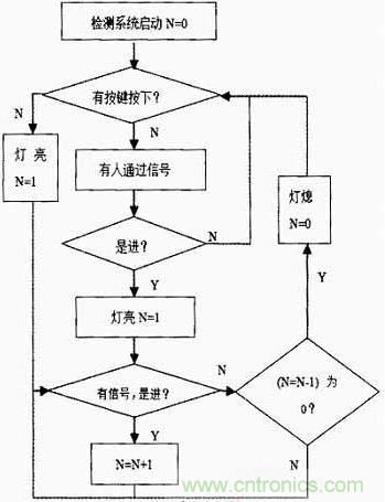 系統(tǒng)流程圖如圖5所示。其中N表示洗手間內(nèi)現(xiàn)有的人數(shù),當(dāng)檢測系統(tǒng)電源連上后,光電傳感器開始檢測,但系統(tǒng)不知道洗手間內(nèi)此時是否有人,默認(rèn)是無人,因而燈是不會亮的,這時按鍵可以用來對系統(tǒng)進(jìn)行調(diào)整。當(dāng)光強增大到一定值時,檢測系統(tǒng)自動停止工作。