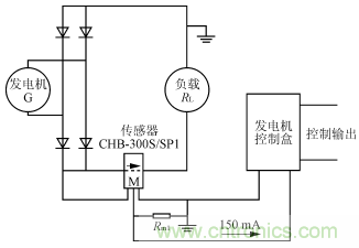 在某型地面車(chē)輛上裝備了一套獨(dú)立的大功率發(fā)電系統(tǒng),該發(fā)電系統(tǒng)設(shè)計(jì)選用了CHB-300S型閉環(huán)霍爾電流傳感器作為系統(tǒng)電流檢測(cè)部件,通過(guò)對(duì)傳感器的輸出信號(hào)進(jìn)行處理,設(shè)定限流工作點(diǎn),確保發(fā)電系統(tǒng)的輸出功率不高于發(fā)電機(jī)的額定功率。閉環(huán)霍爾電流傳感器CHB-300S的應(yīng)用,很好地實(shí)現(xiàn)了上述應(yīng)用目的。如圖3所示,發(fā)電機(jī)G輸出正端匯流母線(xiàn)穿過(guò)CHB-300S/SP1的原邊電流穿孔,由傳感器CHB-300S/SP1檢測(cè)發(fā)電機(jī)的輸出電流,傳感器的輸出IM與發(fā)電機(jī)控制盒相連,由發(fā)電機(jī)控制盒設(shè)定發(fā)電機(jī)的輸出電流控制點(diǎn),依據(jù)此信號(hào),對(duì)發(fā)電機(jī)的輸出電流加以限制,避免發(fā)電機(jī)因輸出功率過(guò)高而發(fā)生故障或損壞,從而保證發(fā)電系統(tǒng)正常工作。